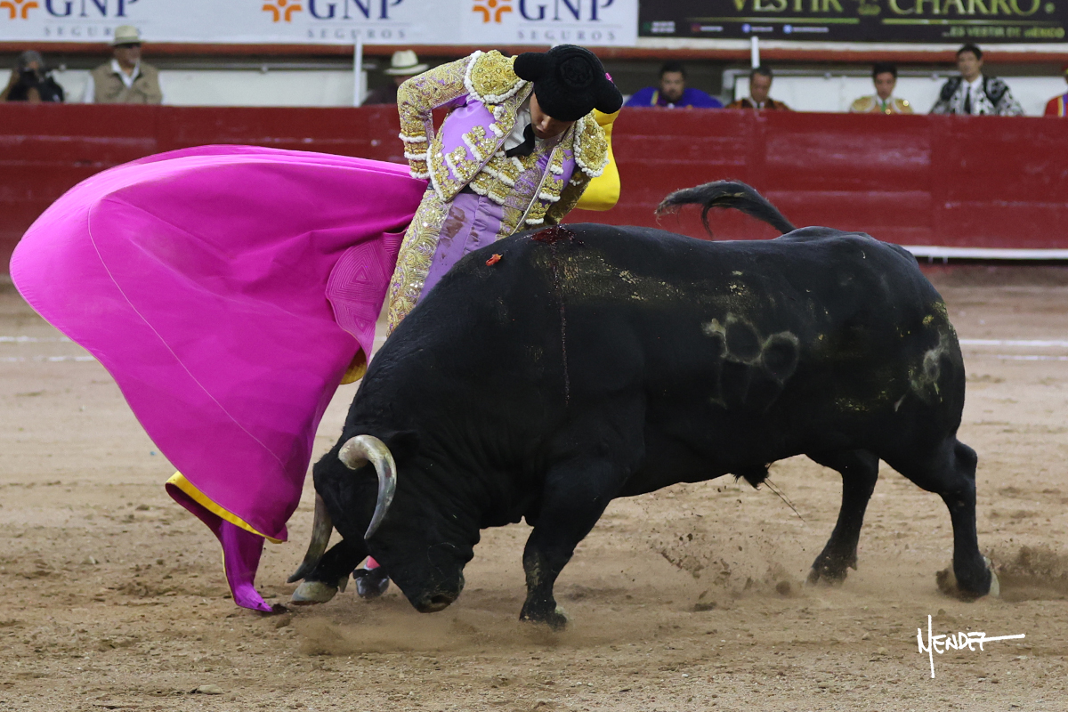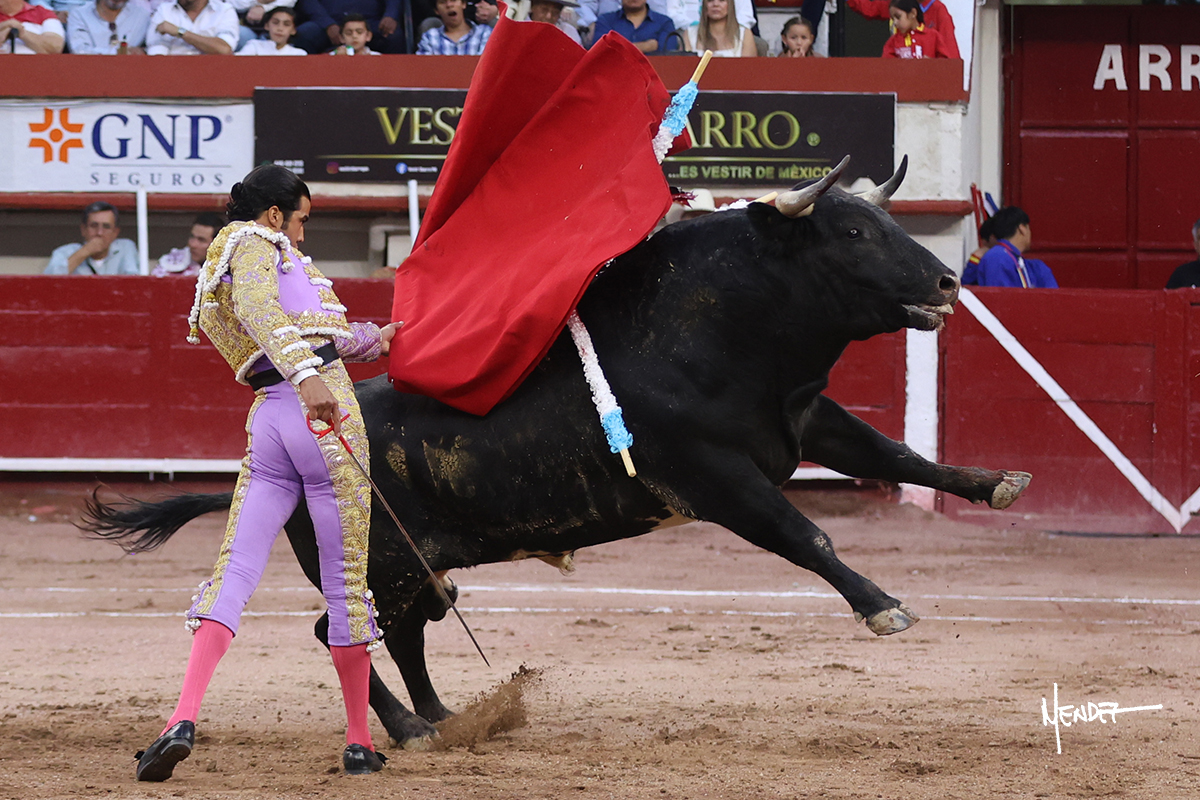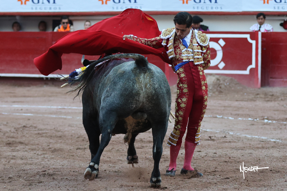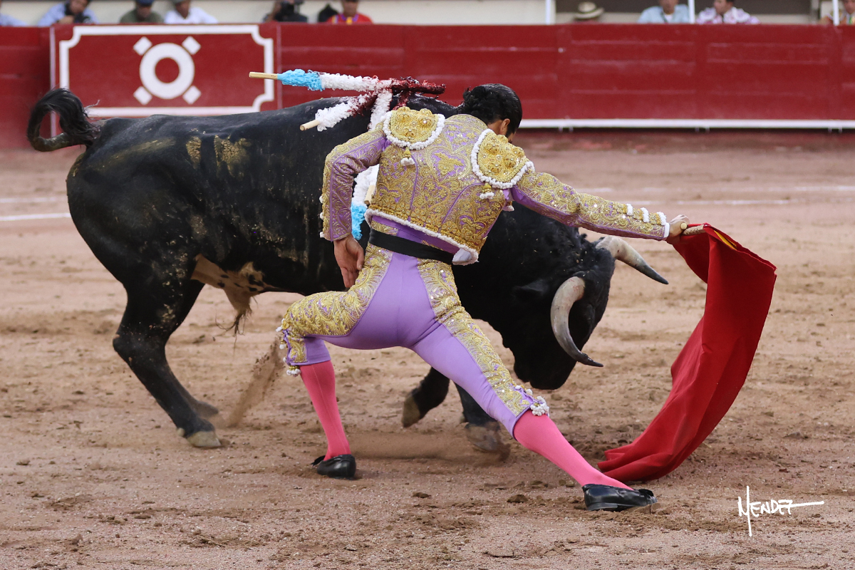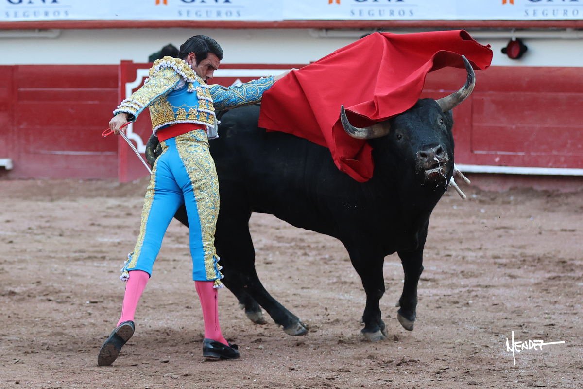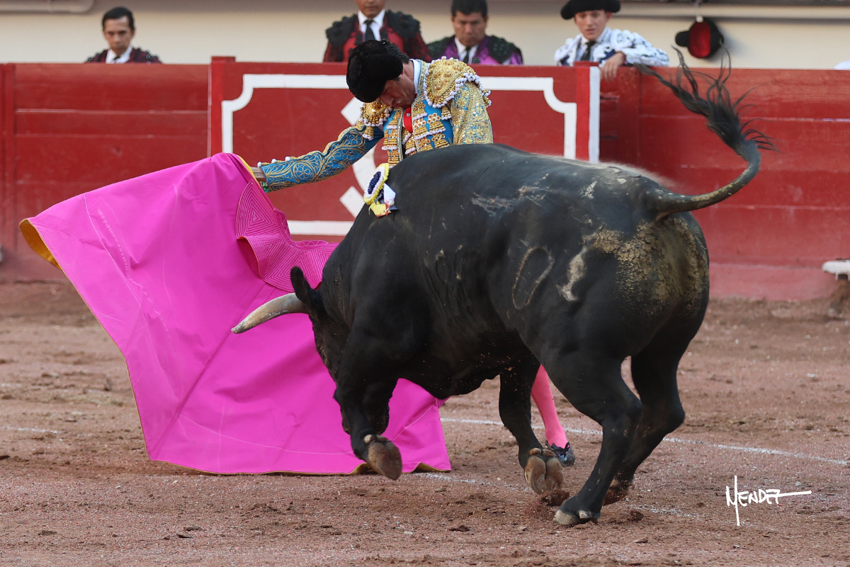 Luis David Adame saludó al segundo con una brega llevada, que no le permitió estirarse. Fue en el quite cuando se lo envolvió por chicuelinas. Se fue a los medios y brindó al público, para después esperarlo a los medios y pasarlo a pies juntos. Aprovechó la inercia para ligarlo, pero estuvo a punto de llevárselo por delante, por lo que le obligó a rectificar. Continuó sobre el derecho, dándole media distancia, cruzándose, para después poder ligar los dos primeros muletazos. Le costaba, así que a base de voz y de tocarlo lo mantuvo dentro. Cambió al izquierdo, marcando el trazo con la ayuda para pasarlo en una tanda breve pero meritoria. Retomó el derecho, sometiéndolo, bajándole la mano para lograr una tanda de ritmo y acople entre ambos. Le dio tiempo, se adornó y continuó en la ligazón del uno a uno, aunque sin evitar que le soltara la cara. Quiso mostrarlo de nuevo al natural, dándole salida, marcando el trazo. Culminó por manoletinas y una estocada certera.