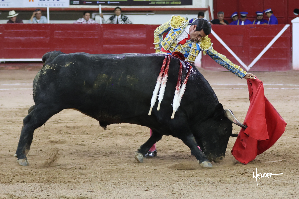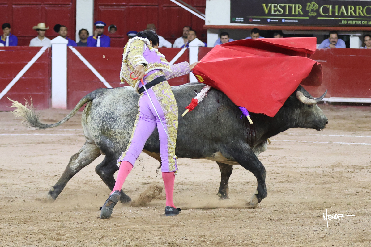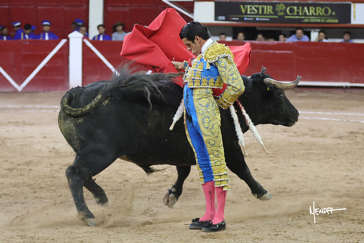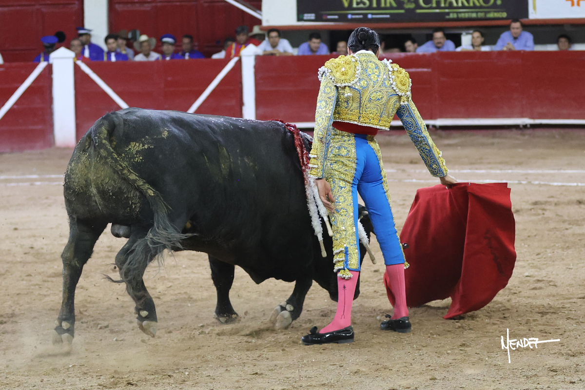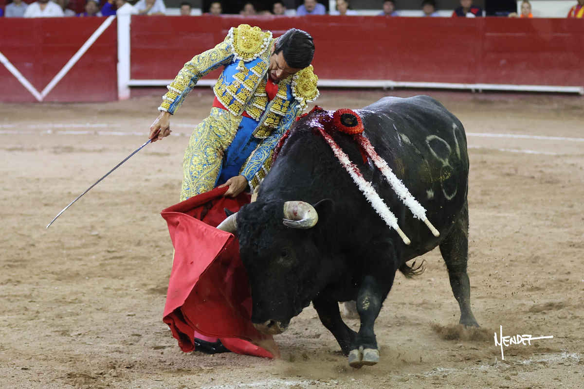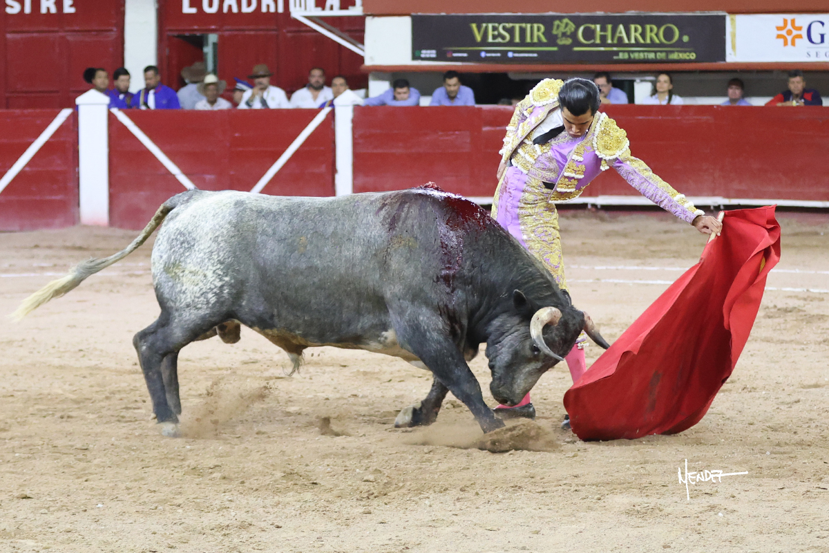 Luis David Adame saludó al segundo con una brega llevada, que no le permitió estirarse. Fue en el quite cuando se lo envolvió por chicuelinas. Se fue a los medios y brindó al público, para después esperarlo a los medios y pasarlo a pies juntos. Aprovechó la inercia para ligarlo, pero estuvo a punto de llevárselo por delante, por lo que le obligó a rectificar. Continuó sobre el derecho, dándole media distancia, cruzándose, para después poder ligar los dos primeros muletazos. Le costaba, así que a base de voz y de tocarlo lo mantuvo dentro. Cambió al izquierdo, marcando el trazo con la ayuda para pasarlo en una tanda breve pero meritoria. Retomó el derecho, sometiéndolo, bajándole la mano para lograr una tanda de ritmo y acople entre ambos. Le dio tiempo, se adornó y continuó en la ligazón del uno a uno, aunque sin evitar que le soltara la cara. Quiso mostrarlo de nuevo al natural, dándole salida, marcando el trazo. Culminó por manoletinas y una estocada certera.