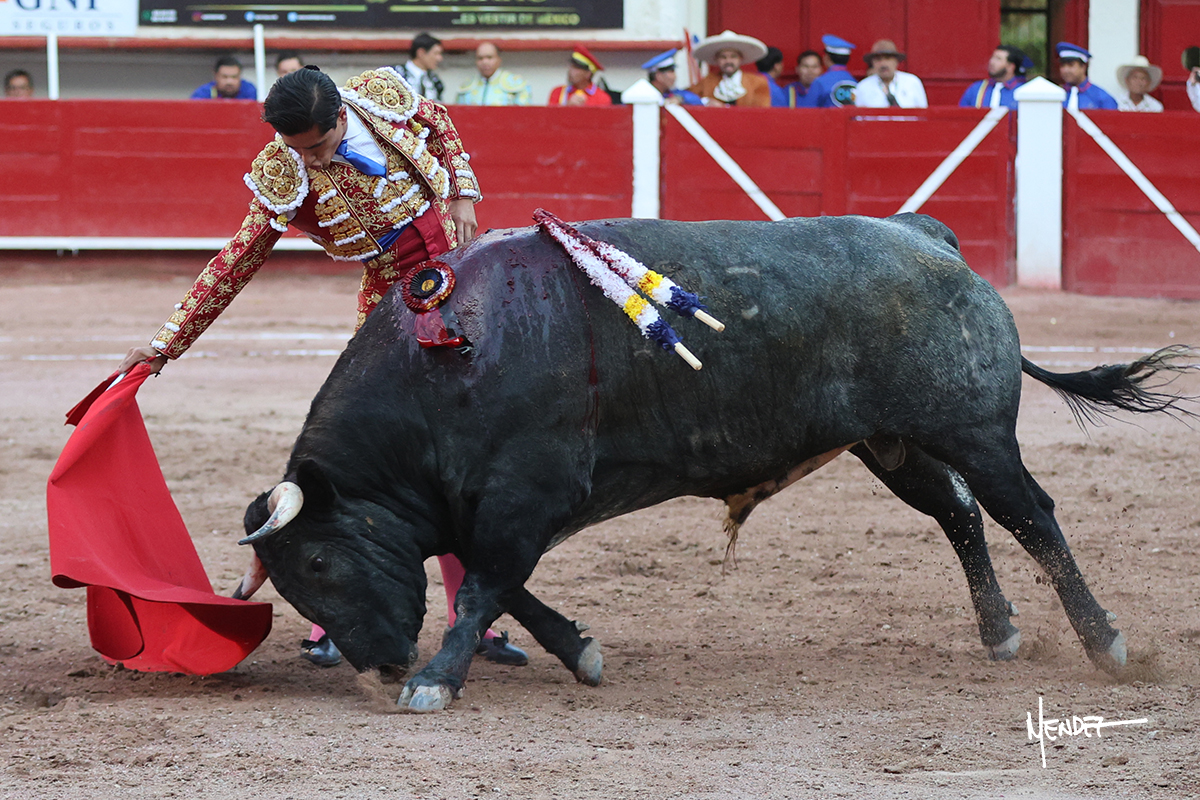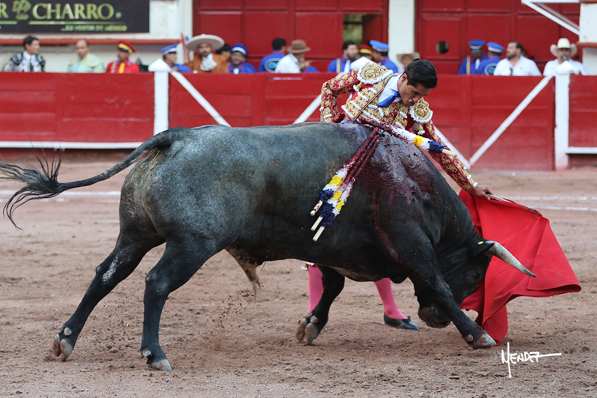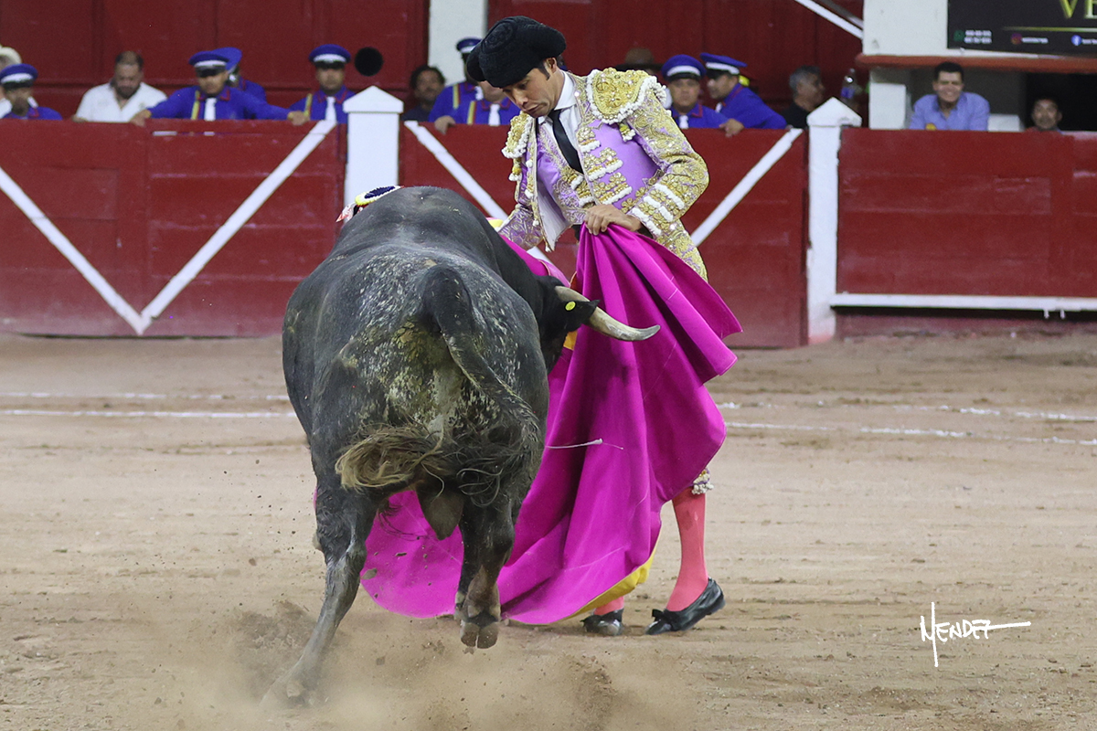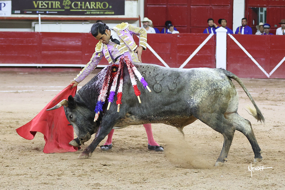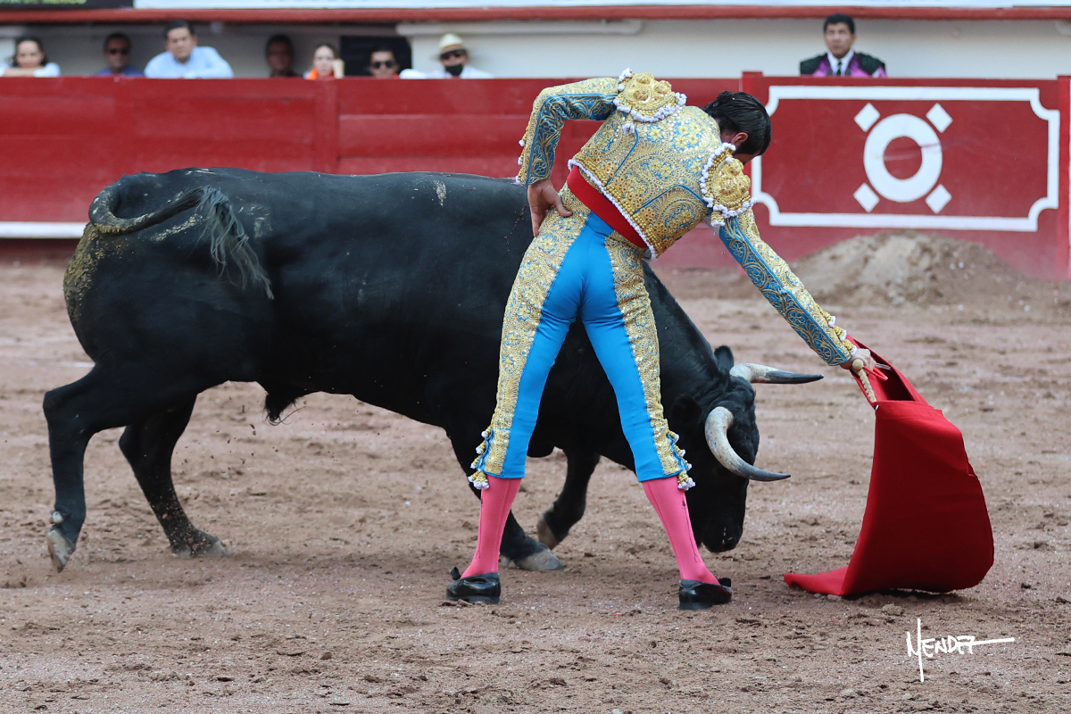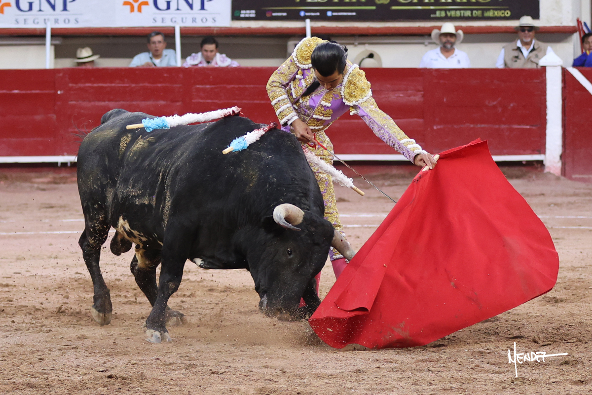 Luis David Adame saludó al segundo con una brega llevada, que no le permitió estirarse. Fue en el quite cuando se lo envolvió por chicuelinas. Se fue a los medios y brindó al público, para después esperarlo a los medios y pasarlo a pies juntos. Aprovechó la inercia para ligarlo, pero estuvo a punto de llevárselo por delante, por lo que le obligó a rectificar. Continuó sobre el derecho, dándole media distancia, cruzándose, para después poder ligar los dos primeros muletazos. Le costaba, así que a base de voz y de tocarlo lo mantuvo dentro. Cambió al izquierdo, marcando el trazo con la ayuda para pasarlo en una tanda breve pero meritoria. Retomó el derecho, sometiéndolo, bajándole la mano para lograr una tanda de ritmo y acople entre ambos. Le dio tiempo, se adornó y continuó en la ligazón del uno a uno, aunque sin evitar que le soltara la cara. Quiso mostrarlo de nuevo al natural, dándole salida, marcando el trazo. Culminó por manoletinas y una estocada certera.