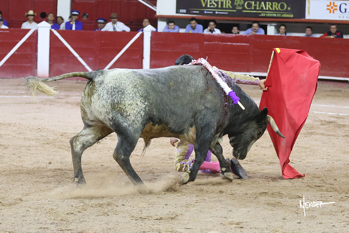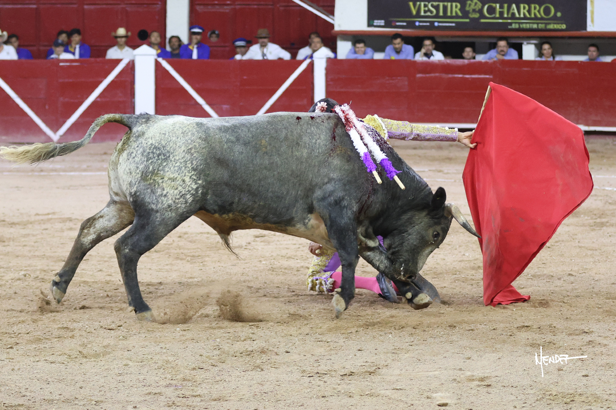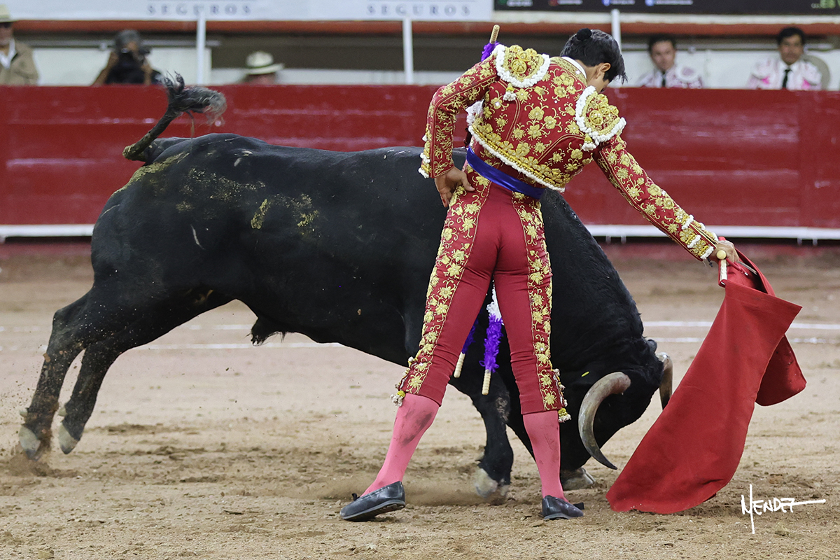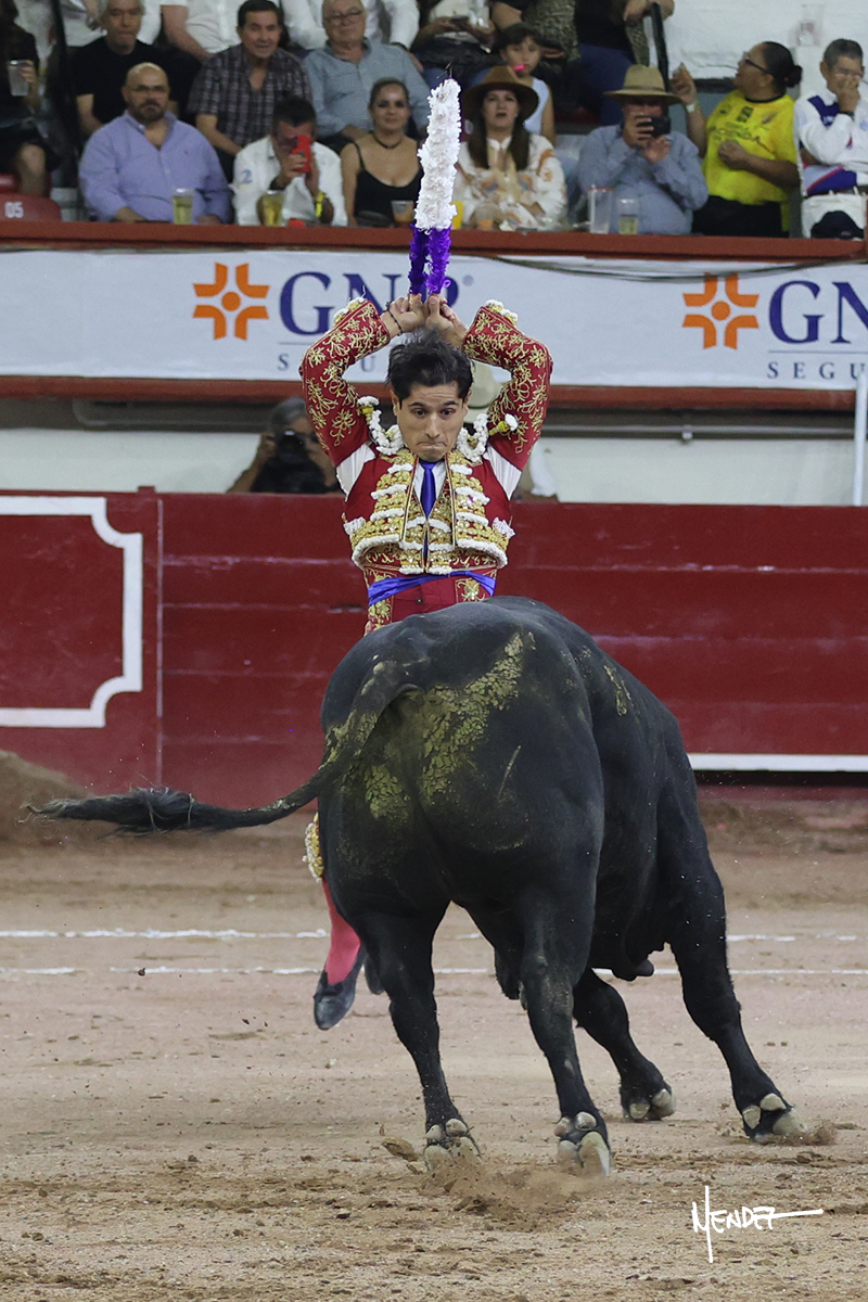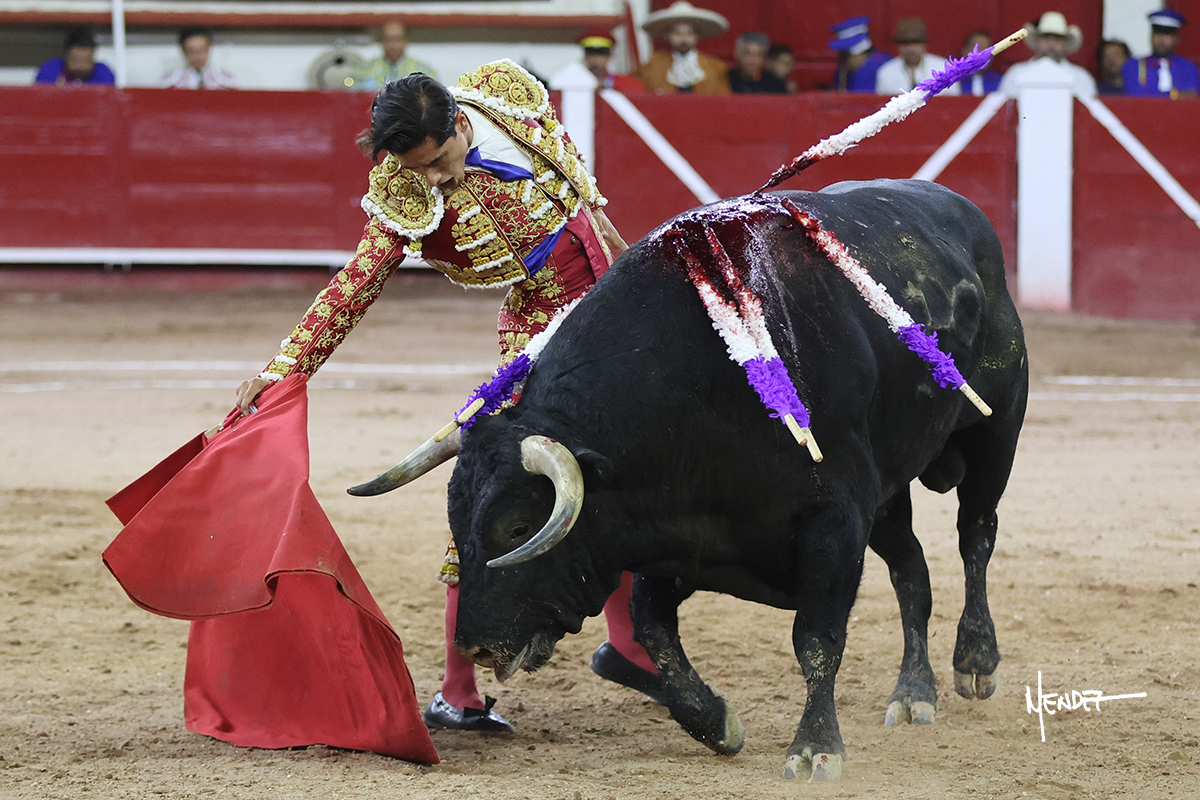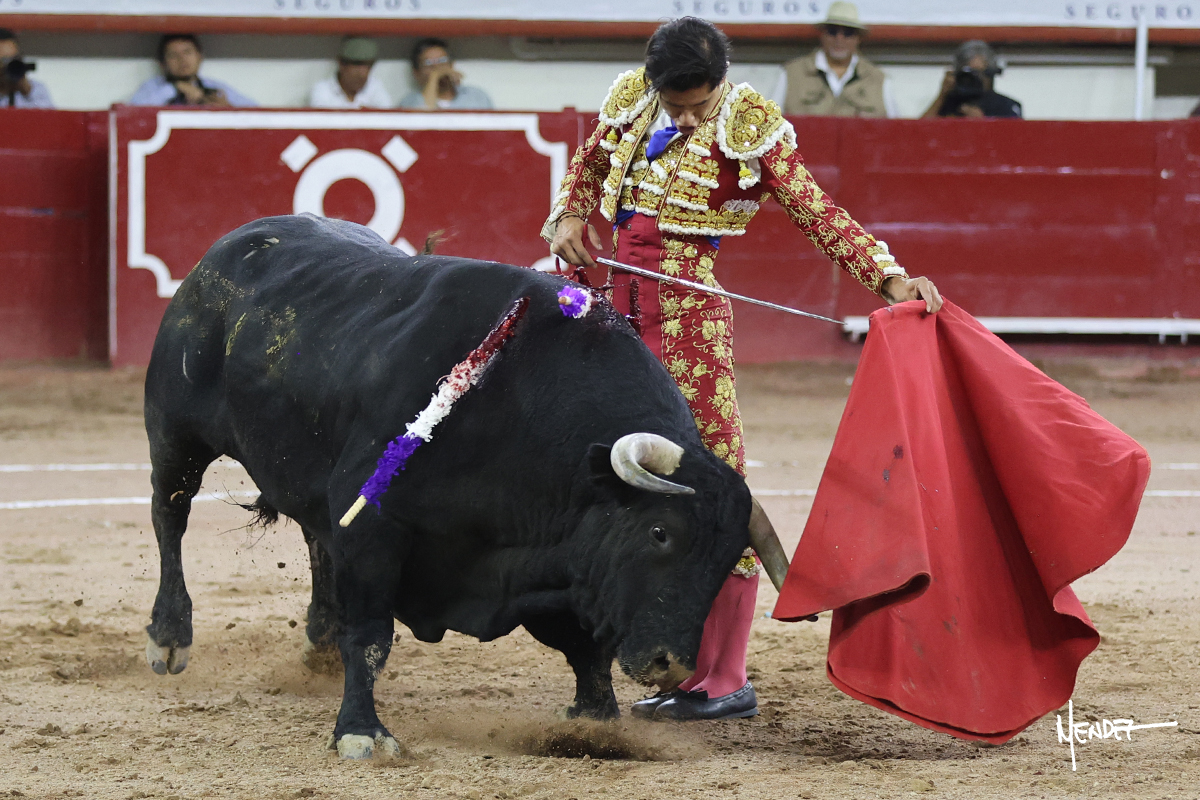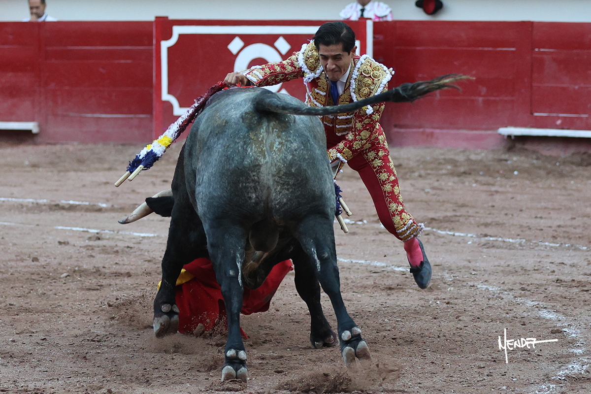 Luis David Adame saludó al segundo con una brega llevada, que no le permitió estirarse. Fue en el quite cuando se lo envolvió por chicuelinas. Se fue a los medios y brindó al público, para después esperarlo a los medios y pasarlo a pies juntos. Aprovechó la inercia para ligarlo, pero estuvo a punto de llevárselo por delante, por lo que le obligó a rectificar. Continuó sobre el derecho, dándole media distancia, cruzándose, para después poder ligar los dos primeros muletazos. Le costaba, así que a base de voz y de tocarlo lo mantuvo dentro. Cambió al izquierdo, marcando el trazo con la ayuda para pasarlo en una tanda breve pero meritoria. Retomó el derecho, sometiéndolo, bajándole la mano para lograr una tanda de ritmo y acople entre ambos. Le dio tiempo, se adornó y continuó en la ligazón del uno a uno, aunque sin evitar que le soltara la cara. Quiso mostrarlo de nuevo al natural, dándole salida, marcando el trazo. Culminó por manoletinas y una estocada certera.