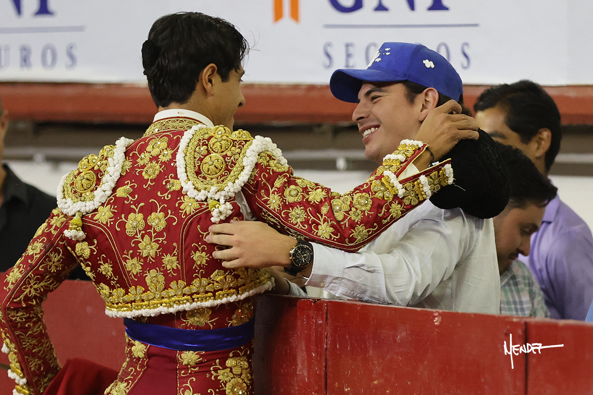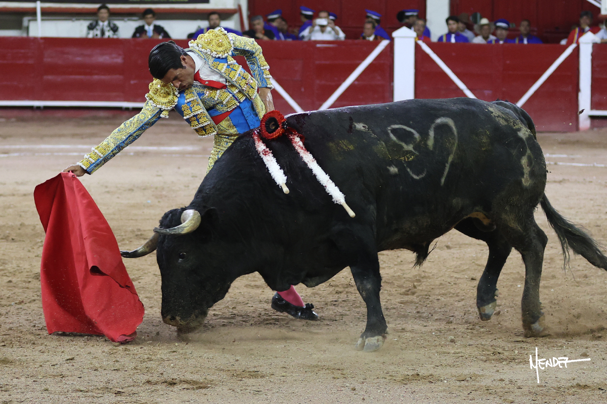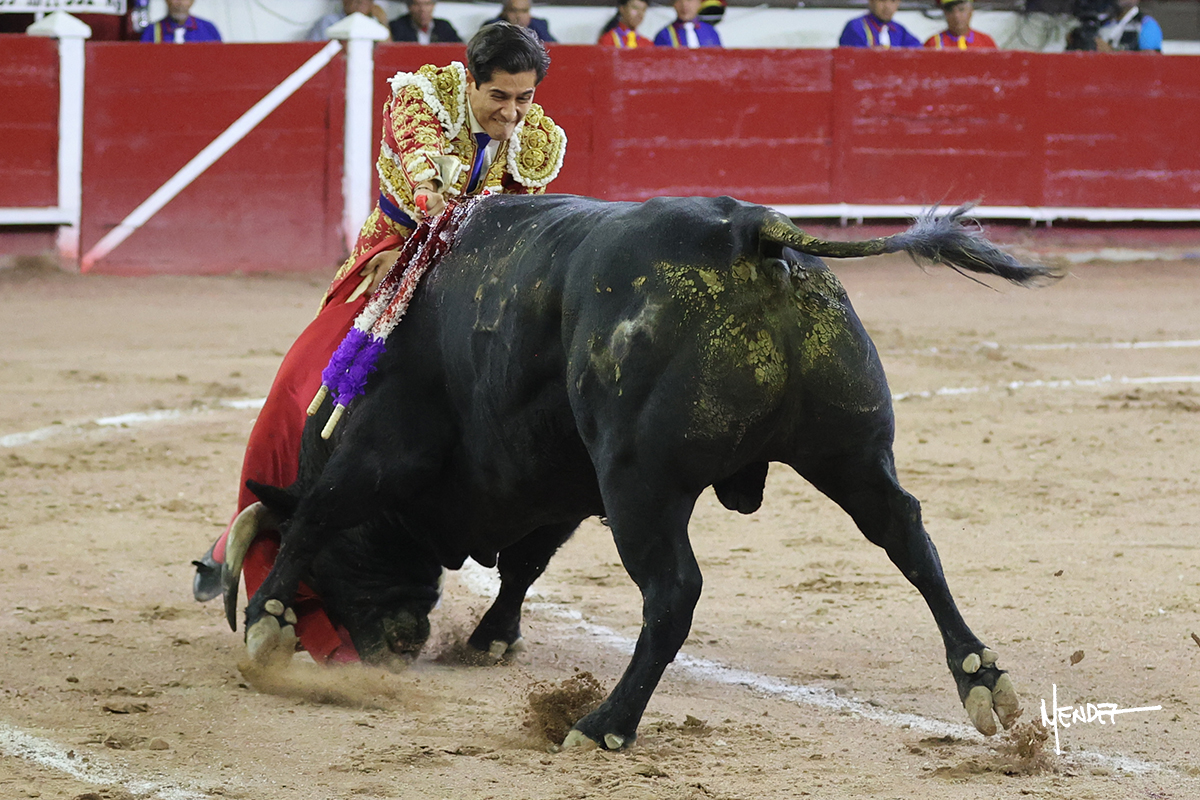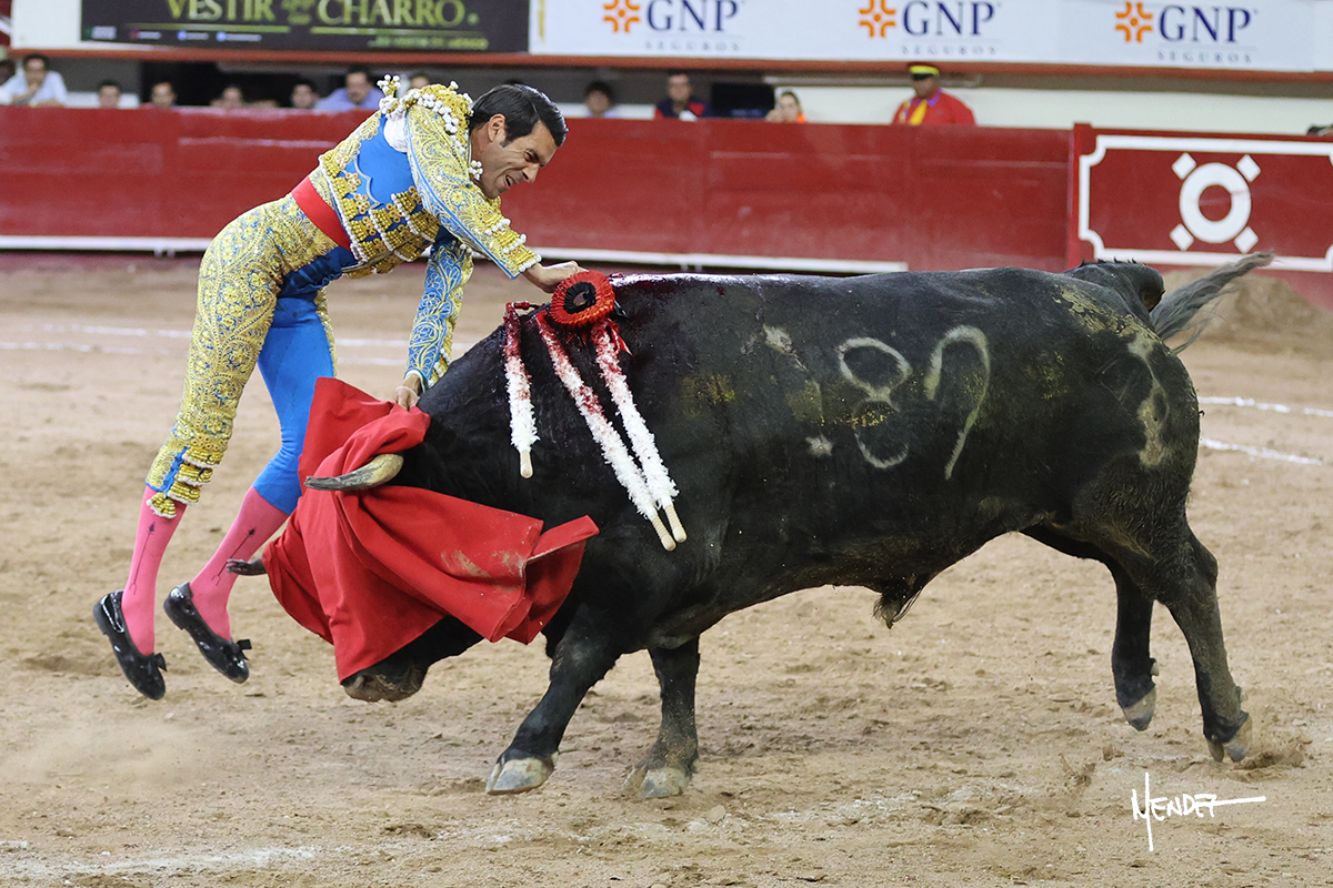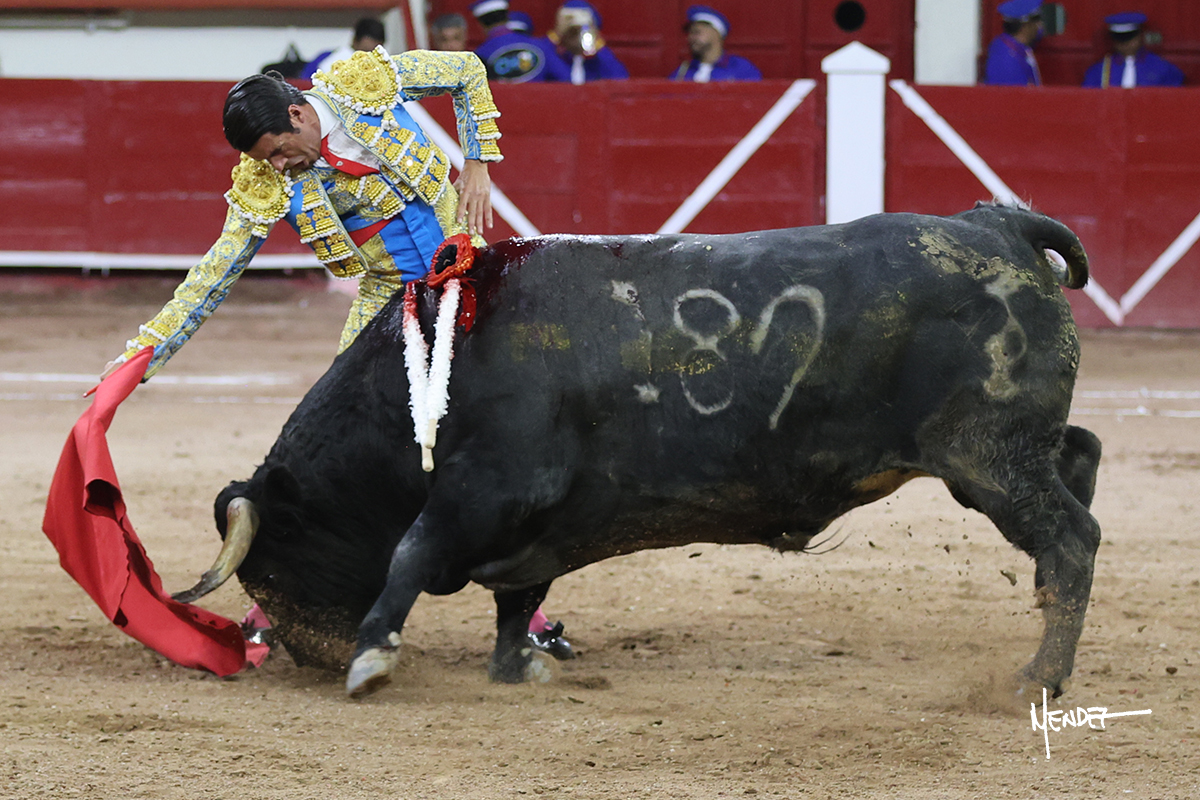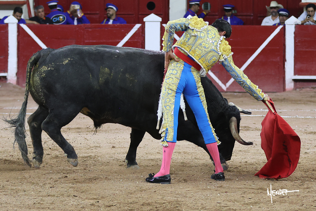 Luis David Adame saludó al segundo con una brega llevada, que no le permitió estirarse. Fue en el quite cuando se lo envolvió por chicuelinas. Se fue a los medios y brindó al público, para después esperarlo a los medios y pasarlo a pies juntos. Aprovechó la inercia para ligarlo, pero estuvo a punto de llevárselo por delante, por lo que le obligó a rectificar. Continuó sobre el derecho, dándole media distancia, cruzándose, para después poder ligar los dos primeros muletazos. Le costaba, así que a base de voz y de tocarlo lo mantuvo dentro. Cambió al izquierdo, marcando el trazo con la ayuda para pasarlo en una tanda breve pero meritoria. Retomó el derecho, sometiéndolo, bajándole la mano para lograr una tanda de ritmo y acople entre ambos. Le dio tiempo, se adornó y continuó en la ligazón del uno a uno, aunque sin evitar que le soltara la cara. Quiso mostrarlo de nuevo al natural, dándole salida, marcando el trazo. Culminó por manoletinas y una estocada certera.