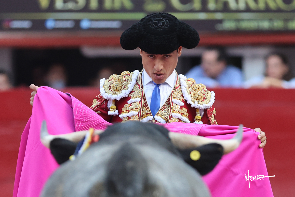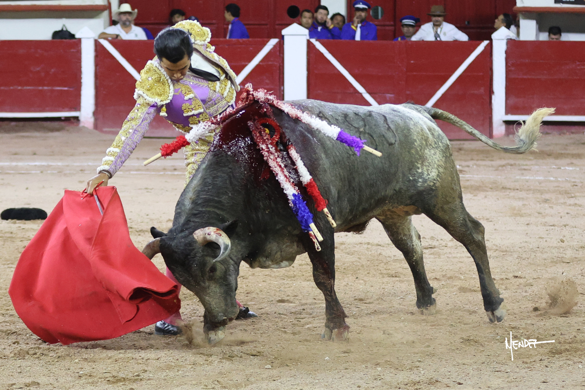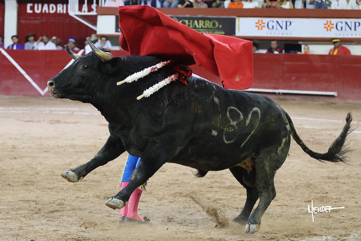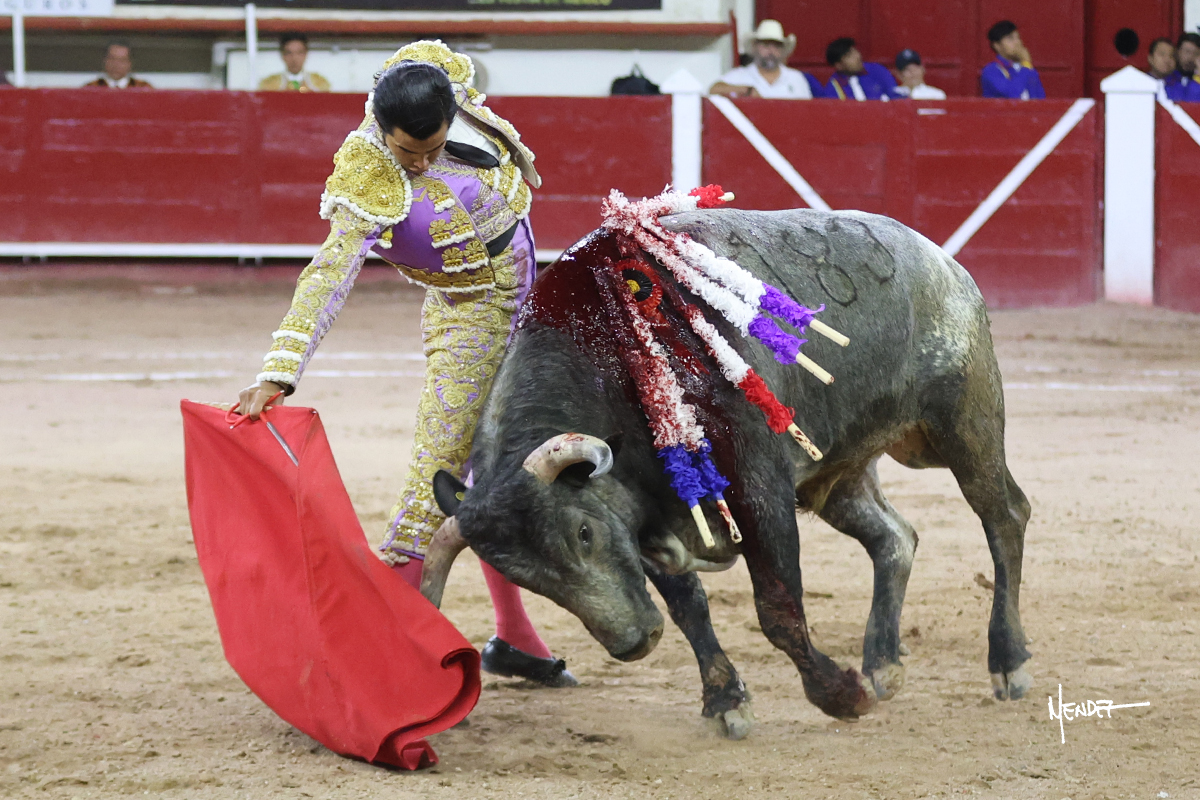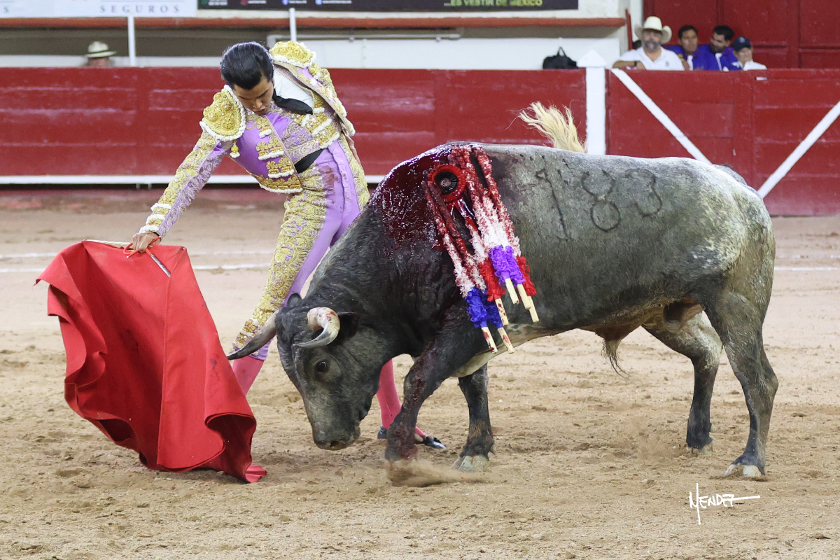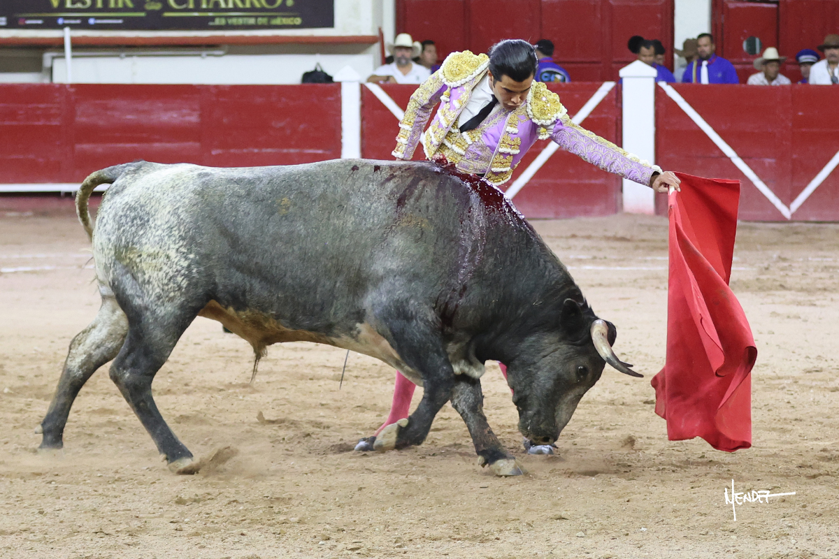 Luis David Adame saludó al segundo con una brega llevada, que no le permitió estirarse. Fue en el quite cuando se lo envolvió por chicuelinas. Se fue a los medios y brindó al público, para después esperarlo a los medios y pasarlo a pies juntos. Aprovechó la inercia para ligarlo, pero estuvo a punto de llevárselo por delante, por lo que le obligó a rectificar. Continuó sobre el derecho, dándole media distancia, cruzándose, para después poder ligar los dos primeros muletazos. Le costaba, así que a base de voz y de tocarlo lo mantuvo dentro. Cambió al izquierdo, marcando el trazo con la ayuda para pasarlo en una tanda breve pero meritoria. Retomó el derecho, sometiéndolo, bajándole la mano para lograr una tanda de ritmo y acople entre ambos. Le dio tiempo, se adornó y continuó en la ligazón del uno a uno, aunque sin evitar que le soltara la cara. Quiso mostrarlo de nuevo al natural, dándole salida, marcando el trazo. Culminó por manoletinas y una estocada certera.