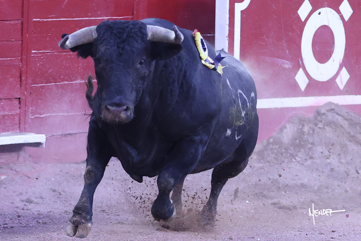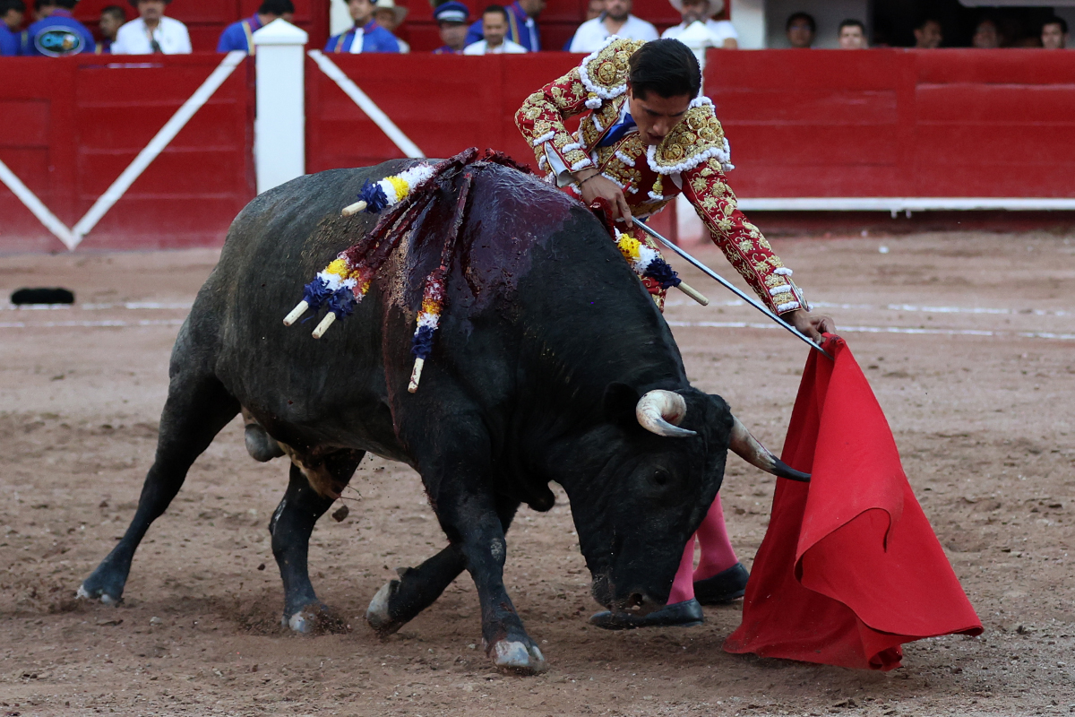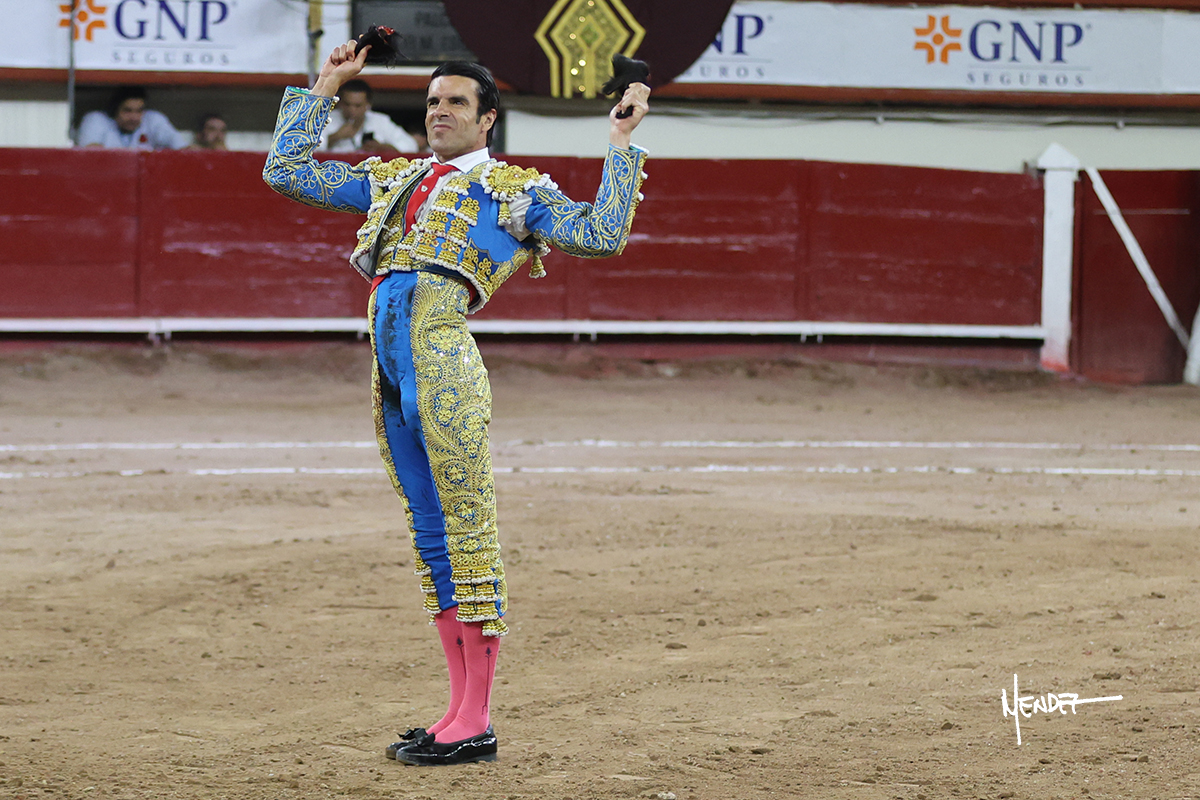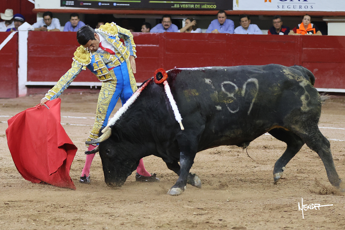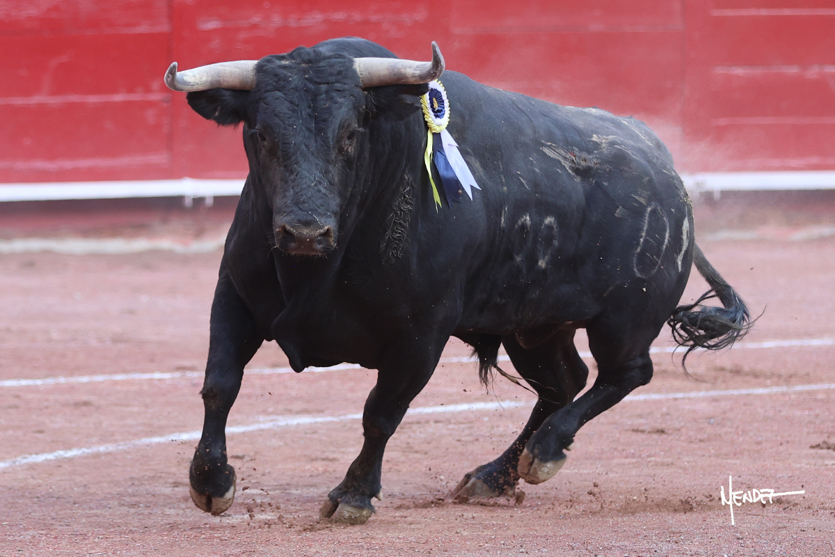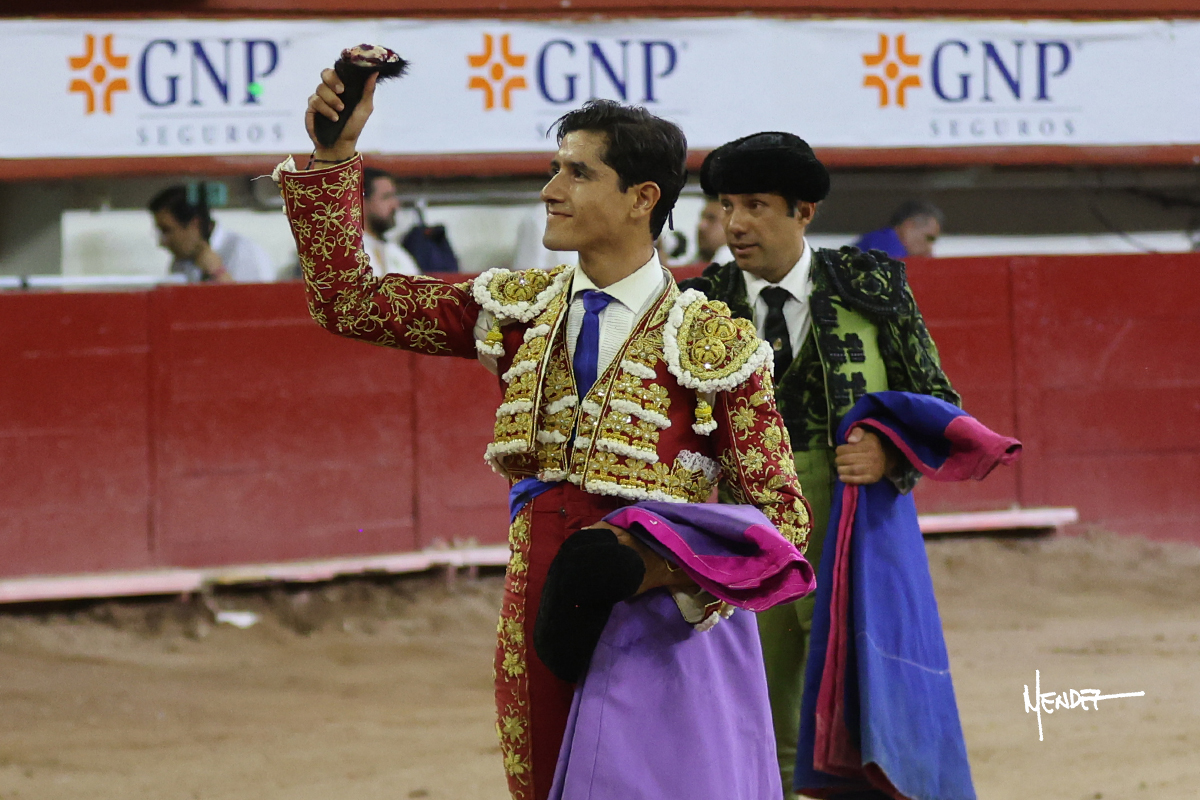 Luis David Adame saludó al segundo con una brega llevada, que no le permitió estirarse. Fue en el quite cuando se lo envolvió por chicuelinas. Se fue a los medios y brindó al público, para después esperarlo a los medios y pasarlo a pies juntos. Aprovechó la inercia para ligarlo, pero estuvo a punto de llevárselo por delante, por lo que le obligó a rectificar. Continuó sobre el derecho, dándole media distancia, cruzándose, para después poder ligar los dos primeros muletazos. Le costaba, así que a base de voz y de tocarlo lo mantuvo dentro. Cambió al izquierdo, marcando el trazo con la ayuda para pasarlo en una tanda breve pero meritoria. Retomó el derecho, sometiéndolo, bajándole la mano para lograr una tanda de ritmo y acople entre ambos. Le dio tiempo, se adornó y continuó en la ligazón del uno a uno, aunque sin evitar que le soltara la cara. Quiso mostrarlo de nuevo al natural, dándole salida, marcando el trazo. Culminó por manoletinas y una estocada certera.