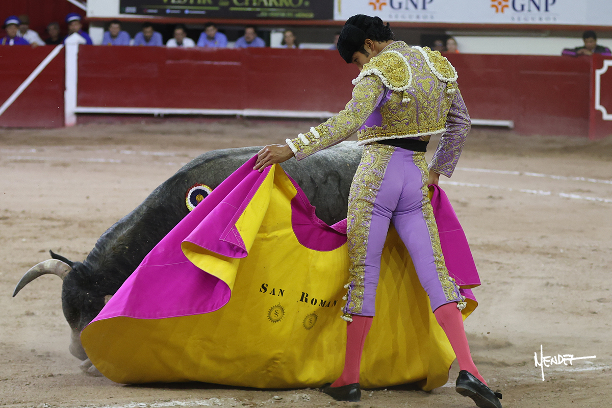 Diego San Román lo recibió de rodillas junto a las tablas para después tratar de bregarlo en los medios, pero estaba lastimado de las manos, por lo que fue devuelto y en su lugar salió un toro con el mismo hierro titular. Lo saludó con una larga cambiada de rodillas en el tercio. En la faena de muleta decidió comenzar de rodillas en los medios, toreando sin probaturas. Siguió en aquellos terrenos, llevándolo por abajo sobre el pitón derecho. El animal se movía y el diestro aprovechó para darle ritmo a la faena. Se lo envolvió, tocándole con insistencia en el hocico para meterlo y correrme la mano en series cortas pero bien llevadas. Cambió al pitón izquierdo, tratando de darle largura al natural, aunque también teniendo que insistirle más para que atendiera a sus demandas. Retomó el pitón derecho de un animal que buscaba abajo el engaño y se mantuvo dentro, fijo en el. Culminó prácticamente metido en tablas y deslució con el acero.